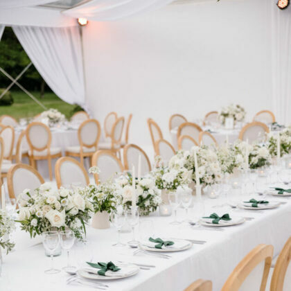 Des tables luxuriantes, ornées de fleurs délicatement agencées, deviennent l’incarnation même de l’amour et de la romance. Chaque fleur, méticuleusement disposée, évoque une histoire d’amour unique, révélant ainsi la magie et la profondeur de leur magnifique union.